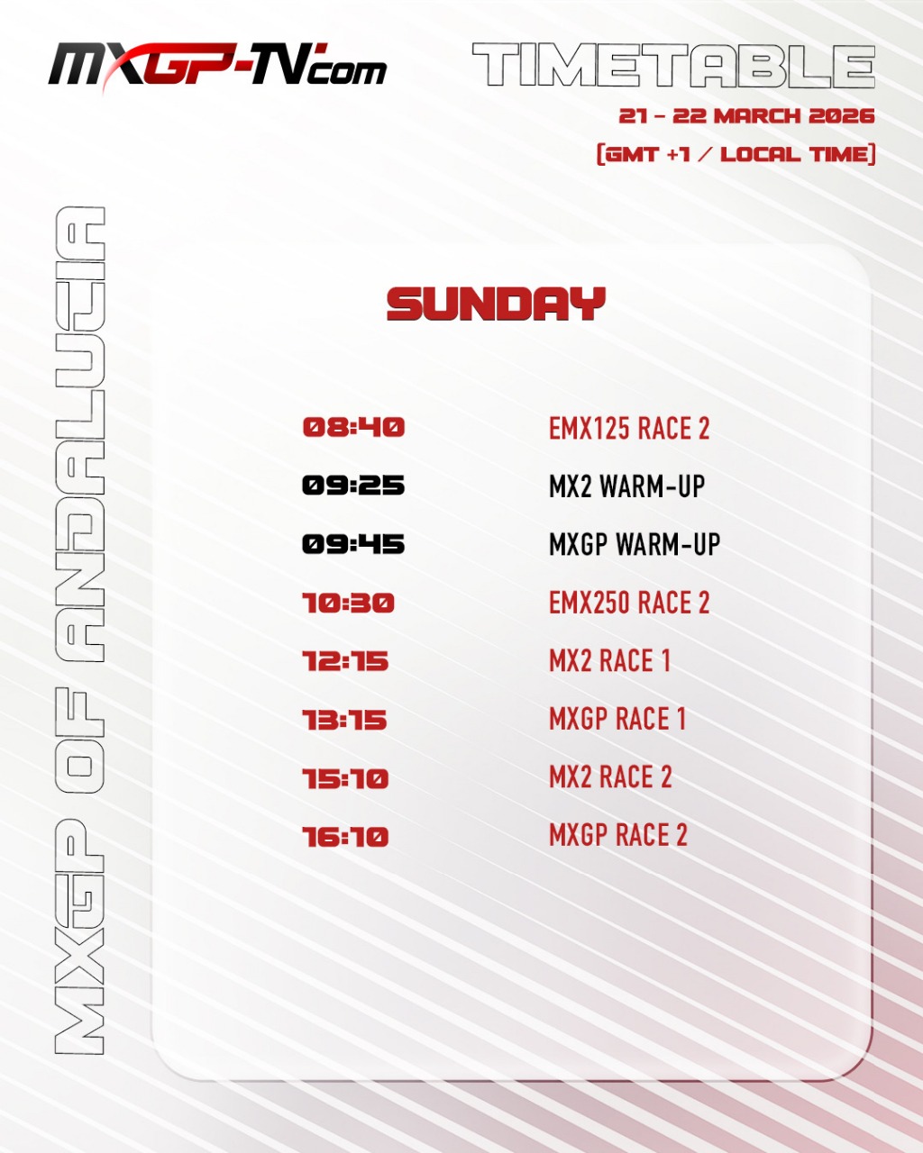 Před zaplněným davem nedočkavých španělských fanoušků se na trati Circuito di Motocross di Almonte koná poprvé v historii FIM Mistrovství světa v motokrosu 2026. Povrch byl pro tuto část světa neobvykle měkký a s odpoledním sluncem osychat!