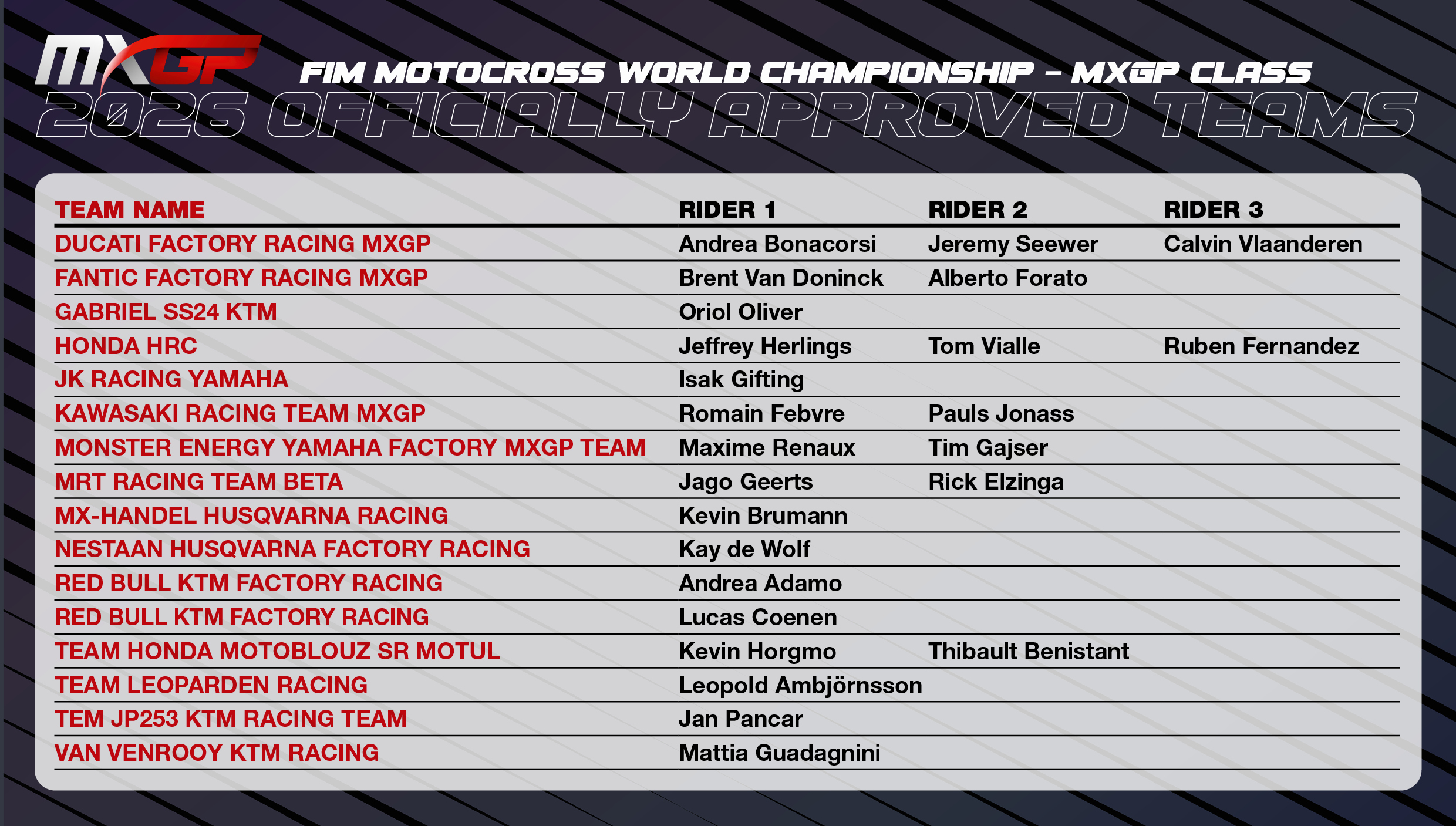 Vzrušující mladý Francouz Mathis Valin zůstává v Kawasaki Racing Team MX2, zatímco jeho nástupce na pozici šampiona EMX250, Janis Reisulis, se připojí ke svému bratrovi Karlisovi v týmu Monster Energy Yamaha Factory MX2. Jeho rival z roku 2025 a bývalý šampion EMX125 Noel Zanocz absolvuje svůj debut v GP pro Van Venrooy KTM.
