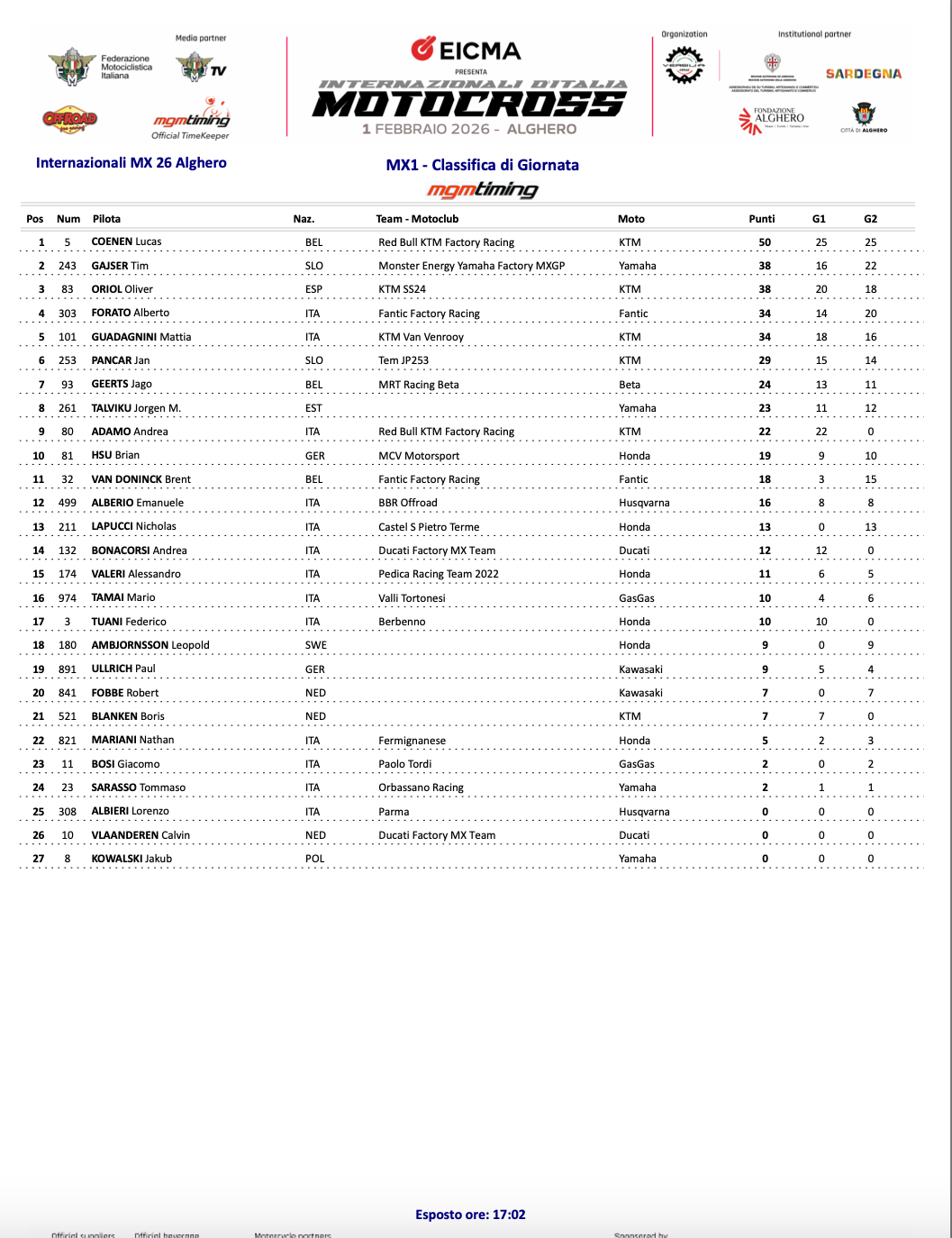 Startovní manévr poslední jízdy úvodního motokrosu na evropském území roku 2026 měl Adamo, před Pancarem, Gajserem, Foratem, L. Coenenem. Pád v první zatáčce měli Geerts a Bonacorsi, když se oba těžce zvedali ze země. Během prvního kola se Gajser dostal před Pancara a okamžitě se snažil předjet vedoucího Itala, Adama. To již byl čtvrtý L. Coenen. Belgičan po trati doslova letěl a ve třetím kole byl třetí. Těsně za vedoucí dvojicí. V dalším kole byl Belgičan jízdou na hranici pádu, první. V polovině jízdy měl pád Forato, když byl poté pátý. Poté upadl i Pancar, který byl následně sedmý. Čtvrtý jezdil Oriol. Ve dvacáté minutě odstoupil Adamo a druhý tak byl Gajser, třetí Oriol, čtvrtý Forato, pátý Guadagnini a šestý Pancar. Adamo svůj motocykl motocykl odalařil společně s Joelem Smetsem do parkoviště závodních strojů. Tři kola před cílem byl po předjetí Oriola třetí Forato. V polsedním kole nechybělo mnoho, aby byl na zemi L. Coenene. Z vítězství v druhé jízdě se radoval Lucas Coenen, před Gajserem, Foratem, Oriolem, Guadagninim, van doninckem, Pancarem, Nicolasem Lapuccim, Talvikem a desátým Geertsem. Na nejvyšší stupínek pódia vystoupal L. Coenene, na druhé Gajser a na třetí Oriol. Mimo pódium byli: Forato, Guadagnini. Pancar, Geerts, Talviku, Adamo a desátý Brian Hsu (Honda).