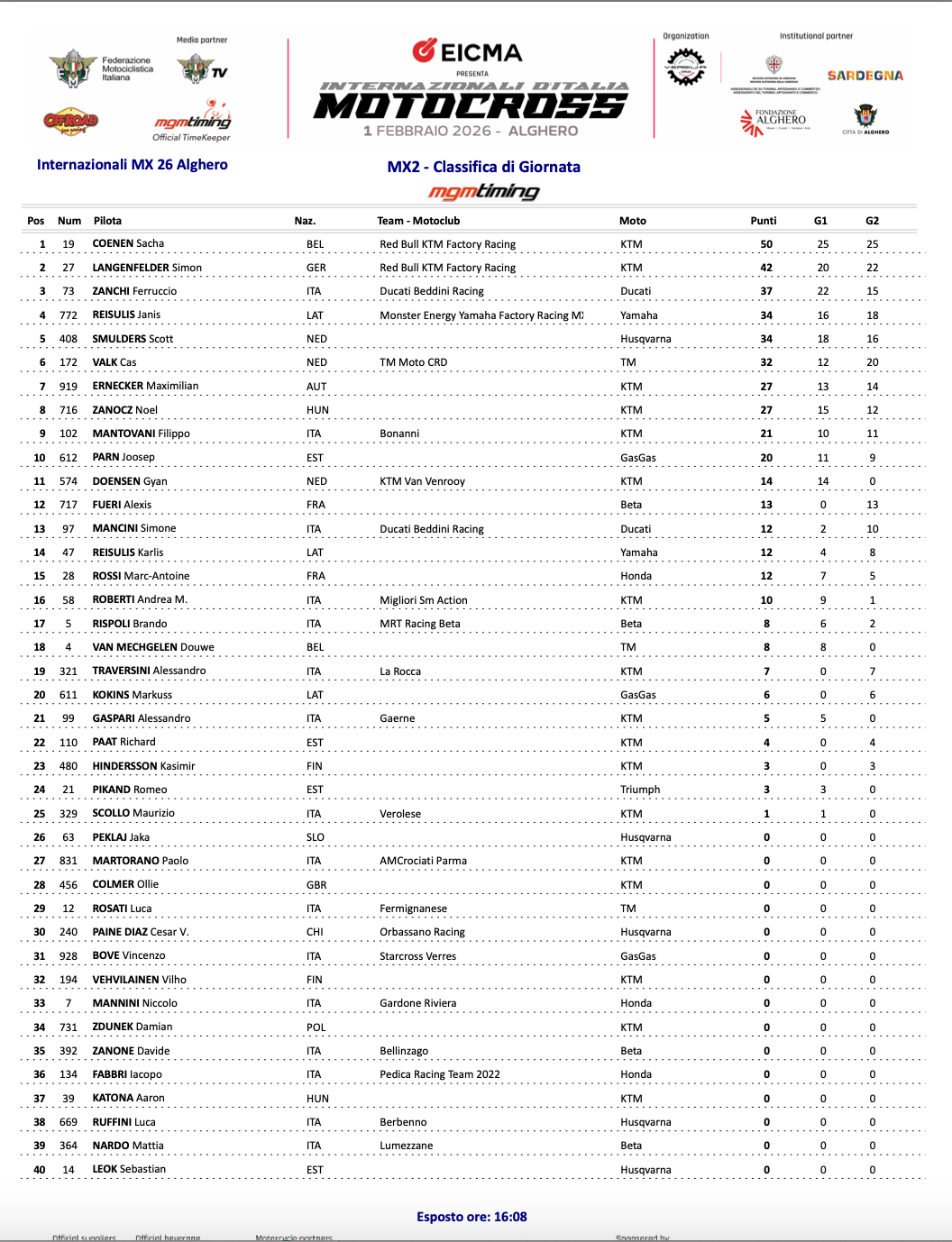 Za slunečného počasí a na silně podmáčené písečné trati se dnes odjel první podnik Mezinárodního Mistrovství Itálie 2026 v Alghero na Sardinii. Tovární jezdec KTM Sasha Coenen podal silný výkon a vyhrál úvodní jízdu evropské sezóny 2026. Malý muž z Belgie se po průměrném startu prodral mezi jezdci a v závěrečných fázích úvodní jízdy MX2 se ujal vedení.