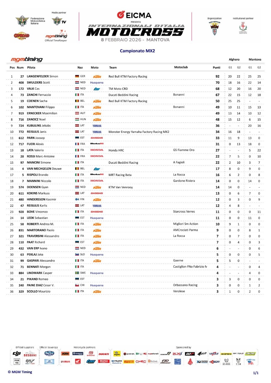 Start do poslední jízdy dne a celého Mezinárodního Mistrovství Itálie měl v Mantově za mlhy, stejně jako v první jízdě Kubulins. Druhý byl Lata, třetí Jens Walvoort (KTM), čtvrtý Valk, pátý Zanchi a šestý Laengenfelder. V polovině třetího kola se Lata dokázal dostat do vedení. Na konci tohoto kola byl čtvrtý za druhým Kubulinsem a třetím Wavoortem, Laengenfelder. Ve čtvrtém kole upadl Kubulins, čímž se propadl na šestou příčku. V sedmém kole byl druhý Laengenfelder. Poté začal Německý jezdec lídra, sektor po sektoru sjíždět. Tři kola před cílem byl Laengenfelder půl sekundy za Latou. O dalšího půl kola byl Laengenfelder v čele, i když se Lata chvíli snažil vzdorovat. Vítězem se tedy stejně jako v jízdě první stal Laengenfeder. Druhý dojel Lata, třetí Valk, čtvrtý Zanchi, pátý Kubulins, šestá Zanoch, sedmý Smulders, osmý Mantovani, devátý Max Ernecker (KTM) a desátý Vincenzo Bove (GASGAS). Vítězem dnešního, druhého podniku Mezinárodního Mistrovství Itálie MX2 v Mantově se stal Laengenfelder, . Mezinárodním mistrem Itálie 2026, MX2 se stal Laengenfelder, před Valkem, Kubulinsem, Smulderesem, Zanchim, Mantovanim, Latou, Erneckerem, Zanoczim a desátým Fuerim. Mezinárodním mistrem Itálie MX2 2026 se stal Laengenfelder, před Smuldersem, Valkem, Zanchim, Sachou Coenenem (KTM), Mantovanim, Erneckerem, Zanoczim, Kubulinsem a desátým Janisem Reisulisem (Yamaha).