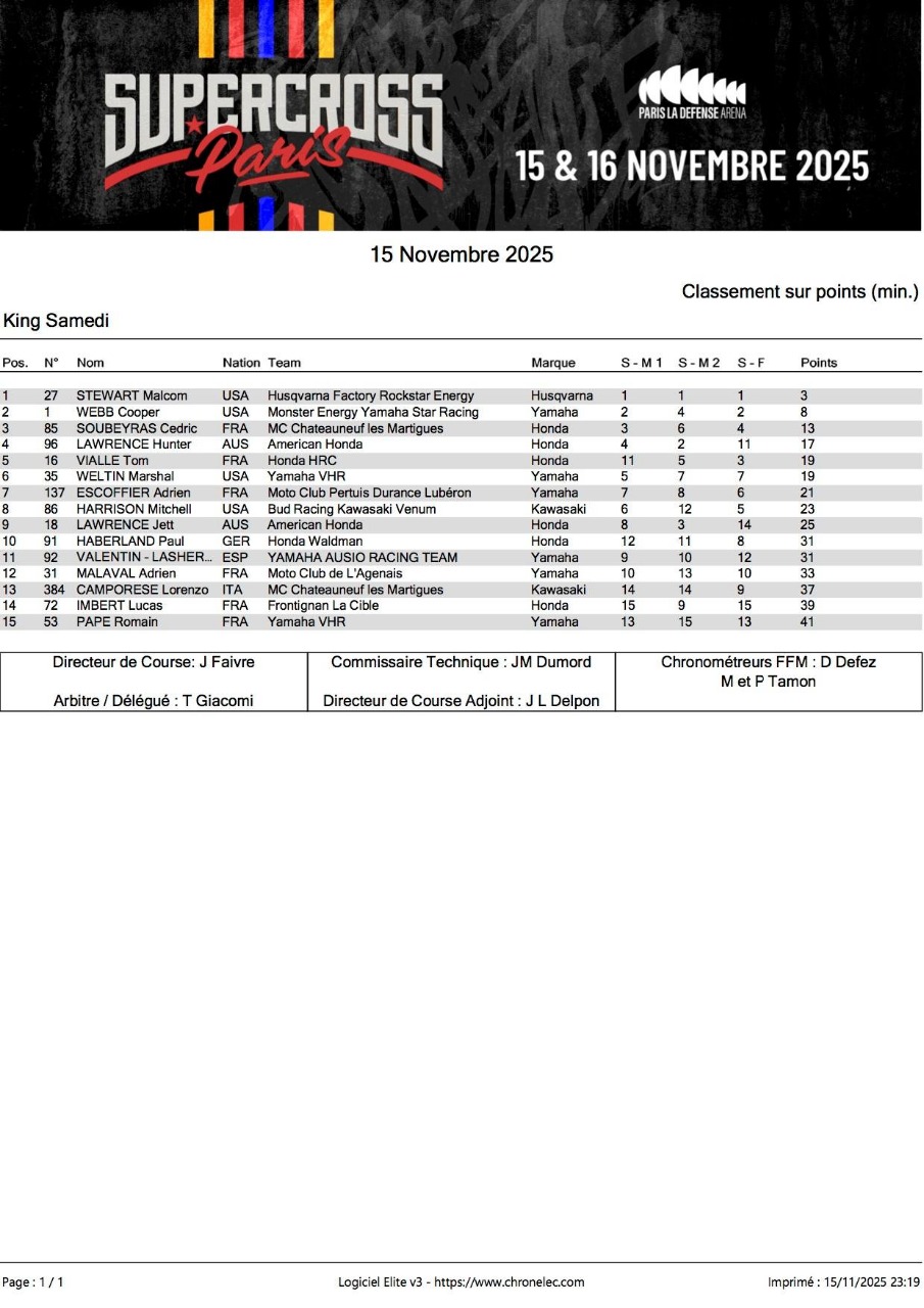 Nejlpeší start do poslední jízdy sobotní pařížské noci měl Jett Lawrence, ale v druhé zatáčce je udolali Stawart a Hunter Lawrence, který dokázal předjet i Soubeyrase. V čele tak byl Stewart. před Huinterem a Jettem Lawrencovými. Čtvrté místo držel Soubeyras, páté Webb a šesté Vialle. Webb se brzy probil před Soubeyrase. Ovšem skvěle jel nadále vítěz prvních dvou jízd Malcom Stewart, když na Huntera Lawrenceho měl náskok kolem dvou sekund a na Jetta pět. Jett posléze při výjezdu ze zatáčkiy před dlouhou roletou upadl a i když poměrně rychle usedl na svůj motocykl nasedl z jízdy odstoupil. Černou sobotu rodiny Lawrencovů podtrhl velký pád Huntera na roletě, aby byl posléze několik minut ošetřován zdravotníky. S obrovským dvaadvaceti sekundovým náskokem zvítězil Stewrart před Webbem a třicet tři sekund před třetím Viallem. Čtvrtý skončil Soubeyras, pátý Harrison, šestý Escoffier, sedmý Weltin. Hunter Lawrence byl klasifikován se ztrátou devíti kol jako jedenáctý a Jett s dvanácti koly ztráty čtrnáctý. Sobotní noc dvoudenního programu ovládl a na nejvyšší stupínek pódia vystoupil Malcom Stewart, na druhý Cooper Webb a na třetí Cedric Soubeyras. Průběžně čtvrtý je Hunter Lawrence, pátý Weltin, šestý Vialle, sedmý Escoffier, osmý Harrison a devátý Jett Lawrence.