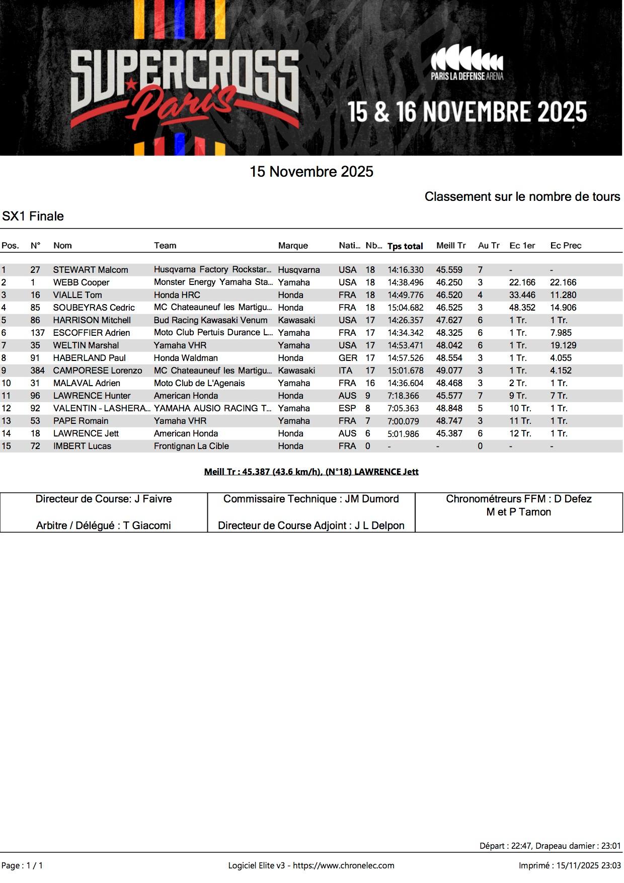 Posléze chyboval na Yamaze jedoucí Webb a tak v čele byl mladší bratr legendárního Jamese Stewarta, Malcom. Americký jezdec také úvodní jízdu 42. ročníku Supercross de Paris vyhrál. Druhý skončil Webb, třetí Soubeyras, čtvrtý Hunter Lawrence, pátý Marshal Welin, šestý Mitchell Harrison, sedmý Adrien Escoffier a osmý Jett Lawrence. Tom Vialle byl nakonec jedenáctý.